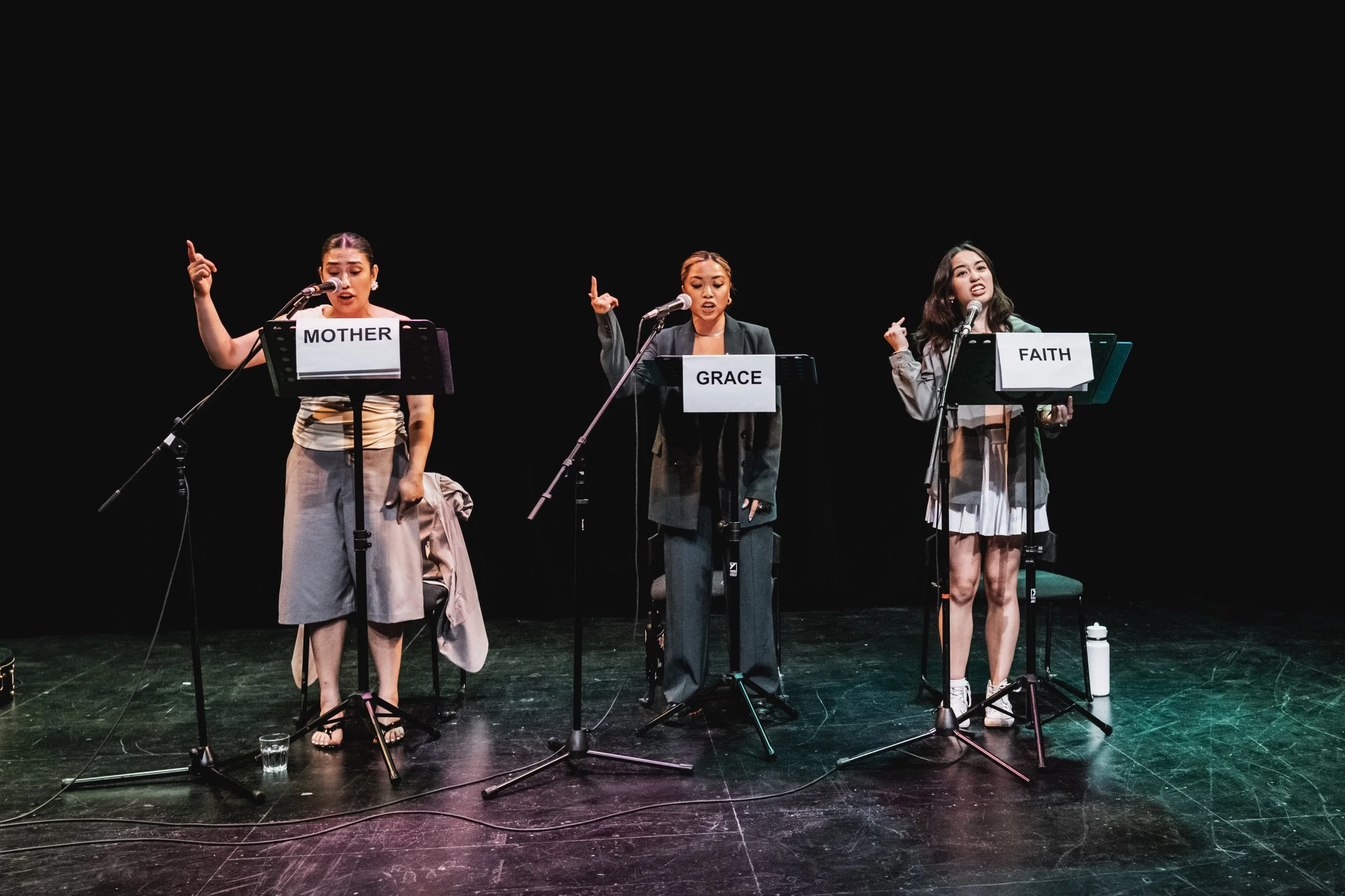 twice blessed is an oddly absurdist, Beckett-like story. With a stage covered in soil and a god eating dog, these three characters find family and joy in one another among their simulacrum of home.
